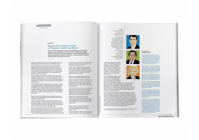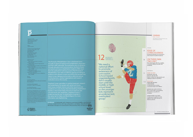 The naming and branding needed to be relevant to the audience and consistent across both publications. The second publication, The Pinnacle of Rehabilitation Care, has a similar graphic naming structure, as The Apex of Trauma Care publication, but it uses the p with a line over it, a medical shorthand for after. Since this publication is geared toward physical medicine & rehabilitation physicians, those that see patients after the most critical care.